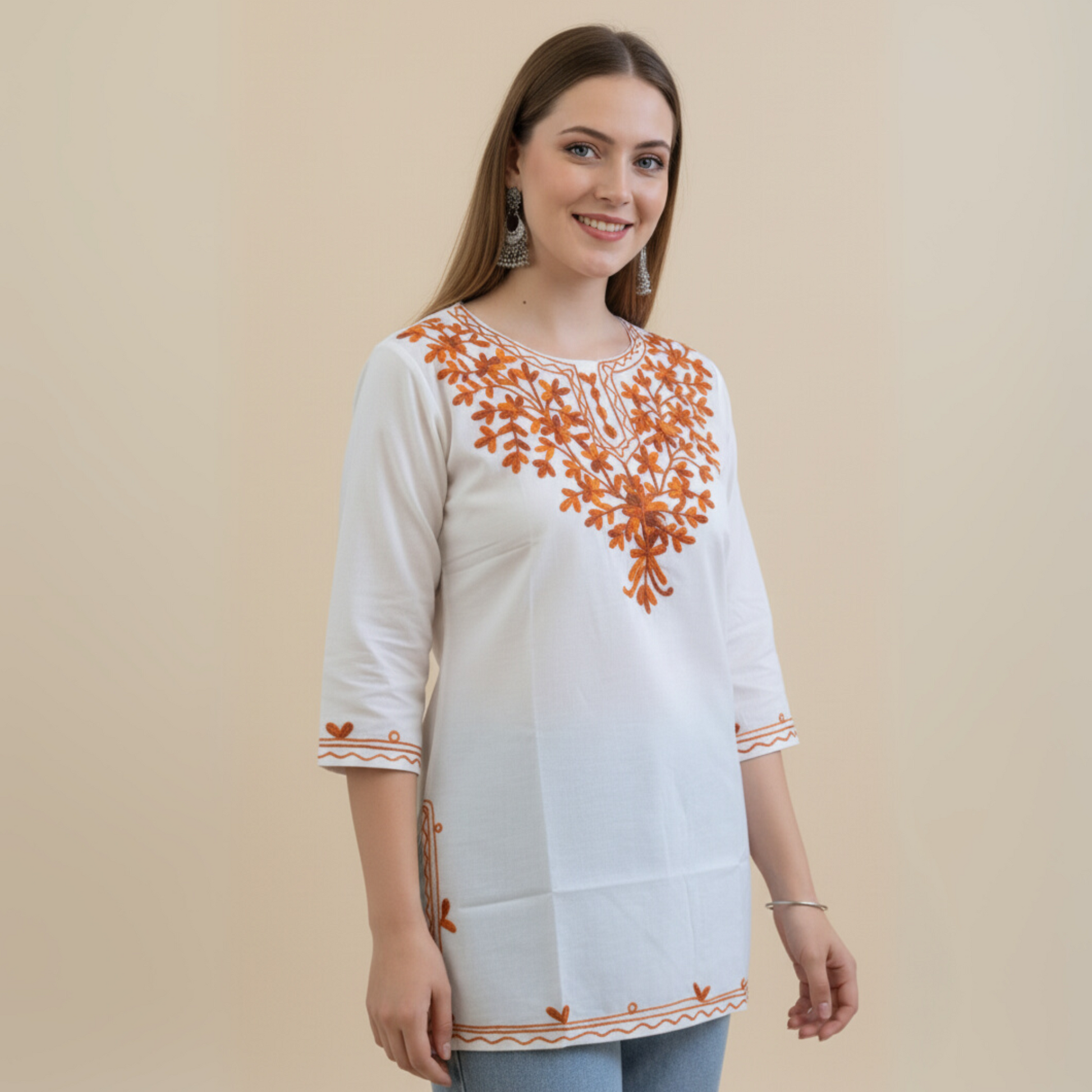 Step into effortless elegance with our stunning White & Brown Floral Chikankari Kurti. This isn't just a piece of clothing; it's a statement of style and comfort. Handcrafted from 100% pure, breathable cotton, this kurti is a dream to wear, keeping you cool and comfortable all day long.